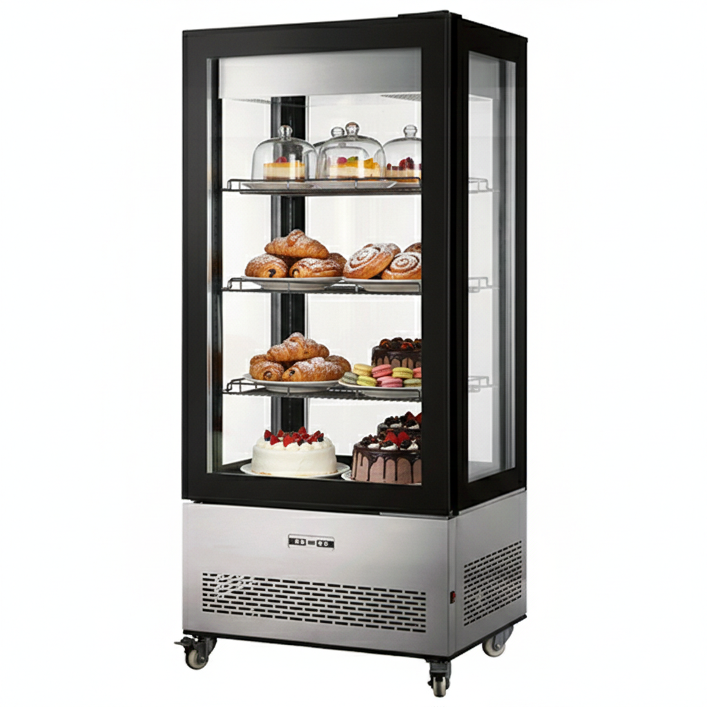 - Featuring brilliant internal LED illumination on the sides as well as stainless steel exterior, this refrigerated display case also has adjustable chrome plated shelves, a digital temperature controller and display, automatic defrost, and ventilated cooling system.